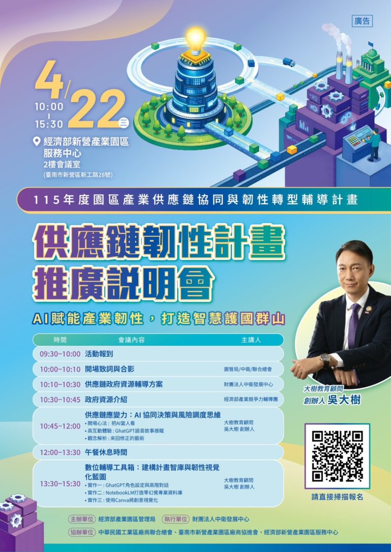 【活動公告】115年度「供應鏈韌性計畫推廣說明會」-AI賦能,強化產業核心競爭力