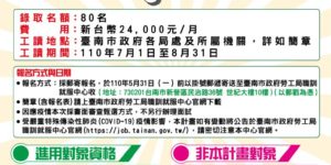 臺南市政府在今年暑假釋出 80 名工讀職缺,供設籍在臺南並就 …